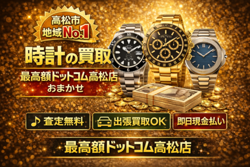 高松市でブランド時計の買取をご検討中の方は最高額ドットコム高松店におまかせください。ロレックス・オメガ・カルティエ・タグホイヤーなど人気ブランドを他店対抗の最高額で査定いたします。付属品なしや動作不良、キズありでも丁寧に査定し、相場を反映した適正価格をご提示。査定は無料、即日現金対応、時間外予約も受付中です。高松市でブランド時計を少しでも高く売るなら地域密着の最高額ドットコム高松店へぜひご相談ください。